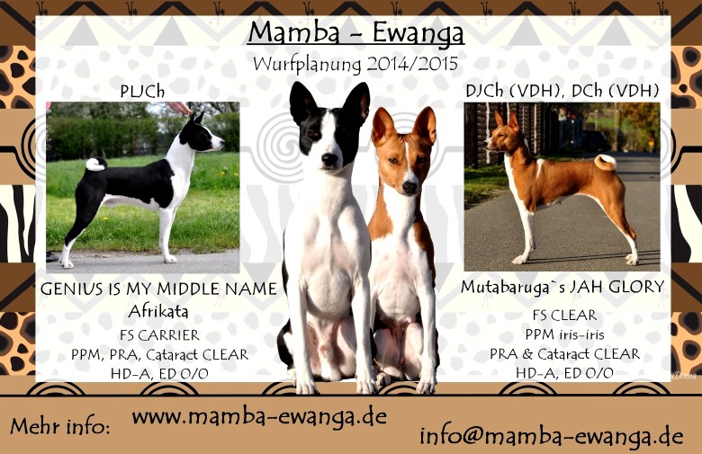 Nach langer und gewissenhafter Suche haben wir den passenden Rüden für unsere Jala gefunden. Es ist der edle "Genius" (Genius Is My Middle Name Afrikata), der ursprünglich in Litauen Afrikata geboren ist und jetzt bei Alicja im Kennel Bahaticca lebt. Genius ist ein sehr eleganter Rüde, der über ein super Gangwerk verfügt. Wir erwarten daher sehr typvolle Welpen, mit bestem Gangwerk, schönen Köpfen und sehr gutem Wesen. Die Welpen werden in den Farben rot/weiß und schwarz/weiß geboren. Beide Elterntiere sind von bester Gesundheit. Die Welpen werden frei vom Fanconi-Syndrom sein.