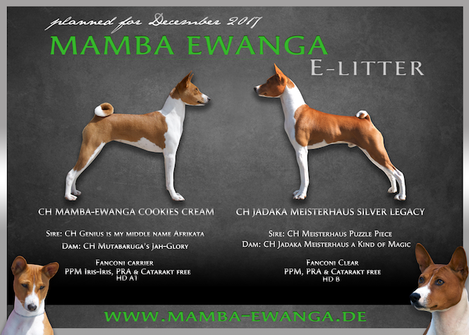 Für unsere Cookie (Ch. Mamba-Ewanga Cookies Cream) aus eigener Nachzucht haben wir uns für den hübschen "Reno" (Ch. Jadaka Meisterhaus Silver Legacy) entschieden. Reno kommt ursprünglich aus den USA und lebt bei Lise Durlot im Kennel Swala-Pala in der Normandie. Reno ist ein sehr eleganter und smarter Rüde, der über ein traumhaftes, raumgreifendes Gangwerk verfügt. Er hat einen traumhaften Kopf mit sehr vielen Falten und hat einen tollen Charackter. Wir erwarten aus dieser excelenten Verpaarung sehr typvolle Welpen, mit raumgreifendem Gangwerk, wundervollen Köpfen und einem sehr guten Wesen. Die Welpen werden in den Farben rot/weiß geboren. Beide Elterntiere sind von bester Gesundheit. Die Welpen werden frei vom Fanconi-Syndrom sein.